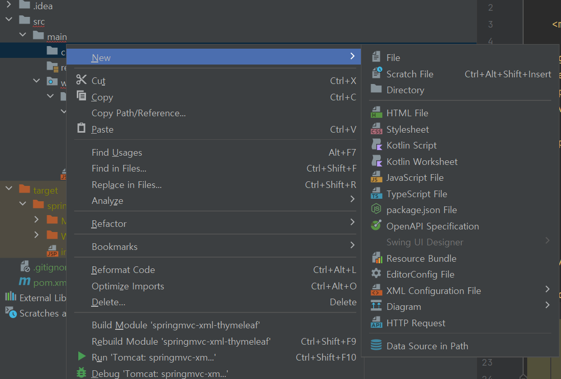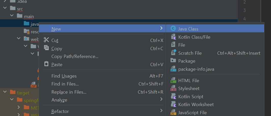 폴더를 src\main\com 으로 만들었을때는 java 파일 생성 메뉴가 나오지 않음