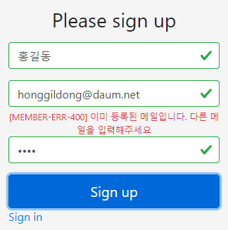 회원가입 중복시 api 호출 json 결과값은 다음과 같다.