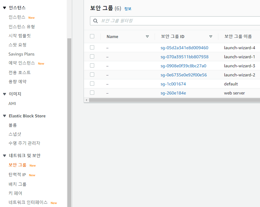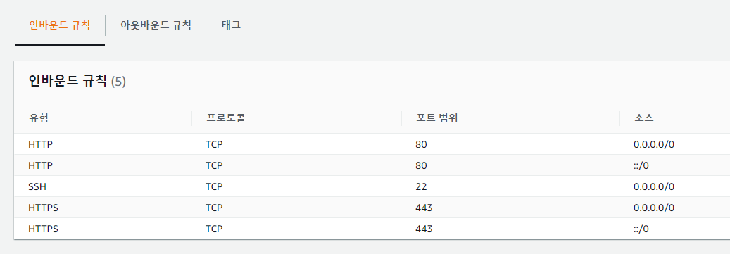 확인하는 메뉴는 네트워크 및 보안> 보안그룹 에서 보안그룹 ID를 클릭하면 인바운드 규칙에서 확인할수 있다.
