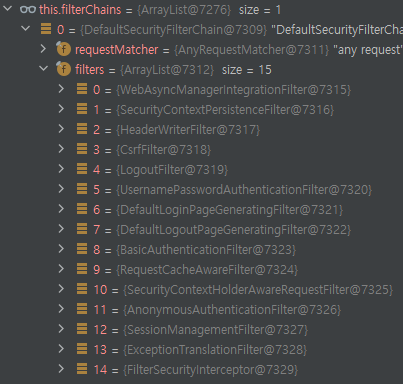 다시 말하면 FilterChainProxy는 SecurityFilterChain의 리스트를 가질수 있고, SecurityFilterChain은 여러개의 필터를 가질수 있다는 말이다.
