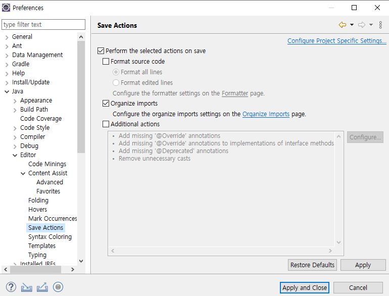 인텔리제이를 사용하다가 이클립스를 사용하면 불편한게 자동저장 및 import이다. 그래서 비슷하게 설정하는걸 한번해보았다.