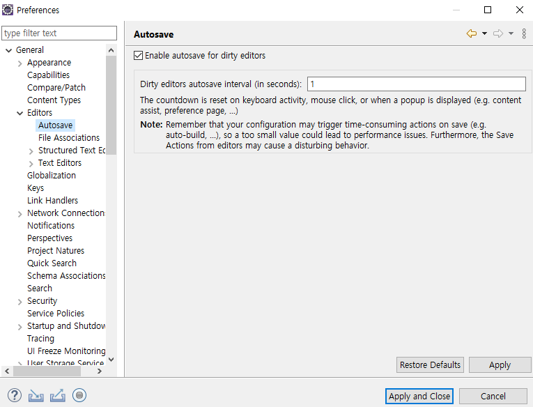 먼저 auto save 옵션을 활성화하고 save간격을 1초로 지정한다.