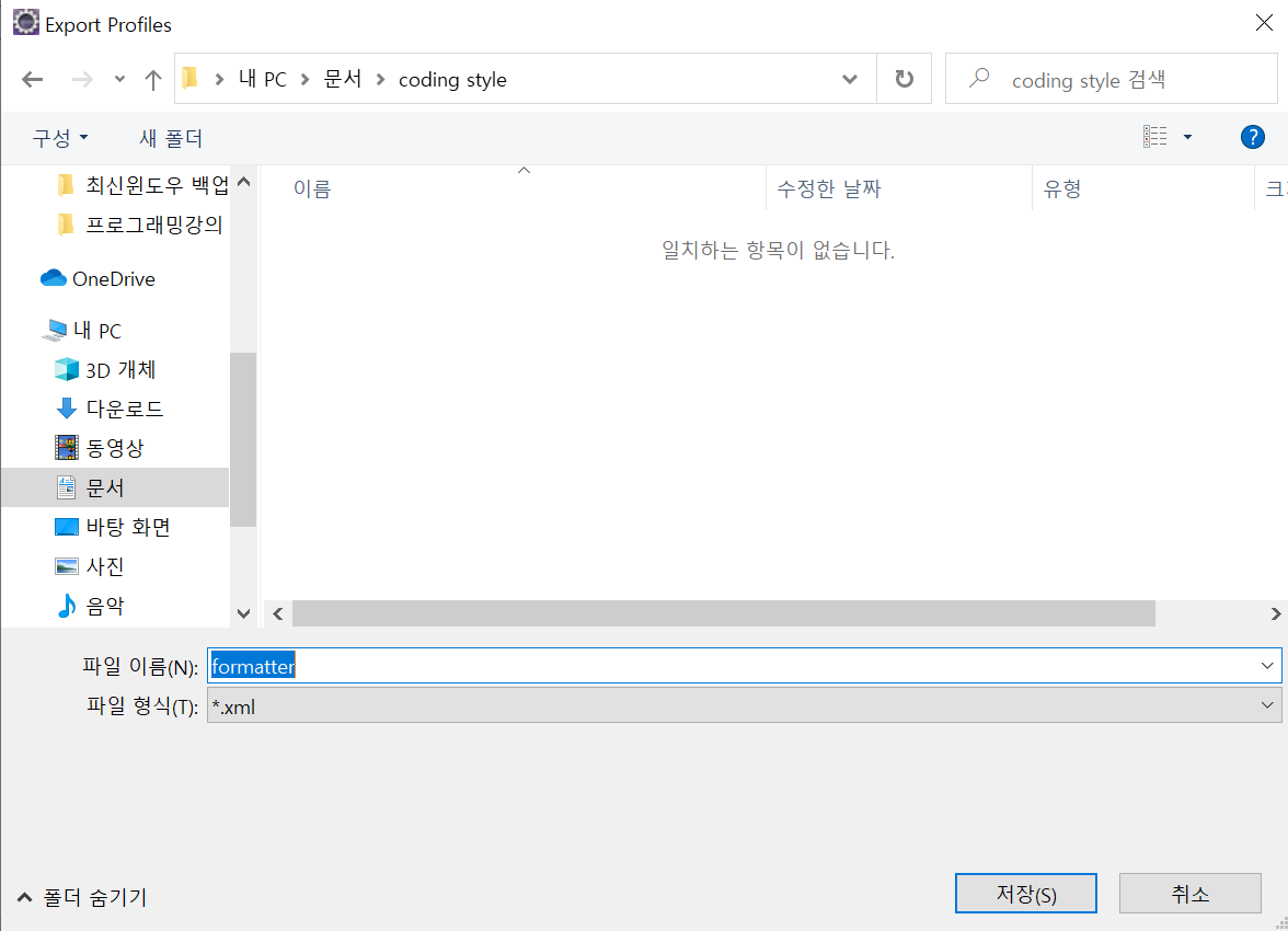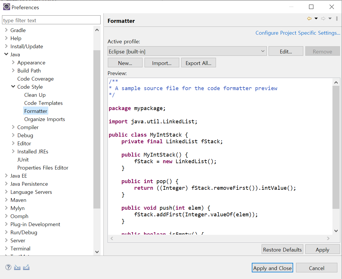 먼저 이클립스에 Java > Code Style > Formatter로 이동하여 Export All 버튼을 클릭한다.