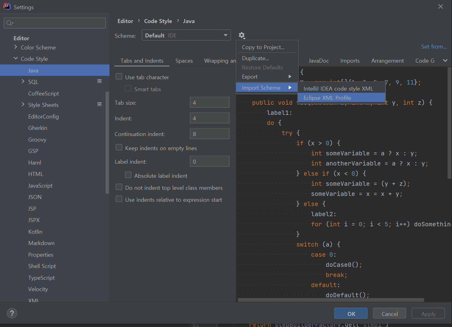 Editor > Code Style > Java 선택후 import schema > Eclipse XML Profile을 클릭하고 export xml파일을 선택하고 apply를 클릭하면 적용이된다.