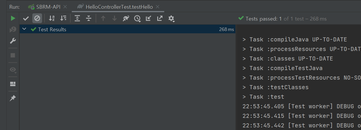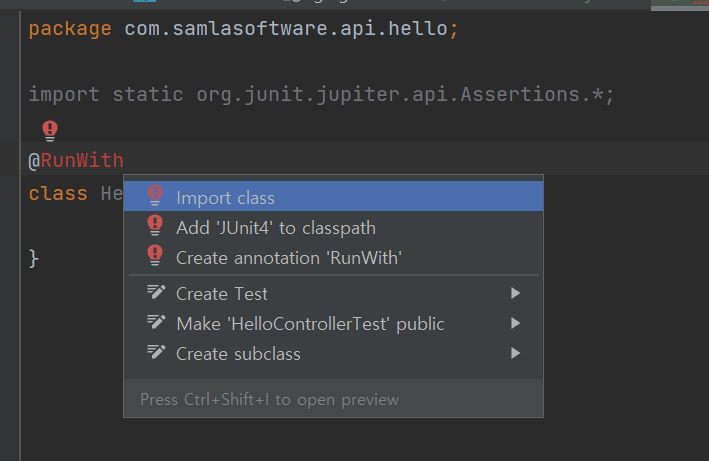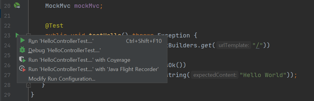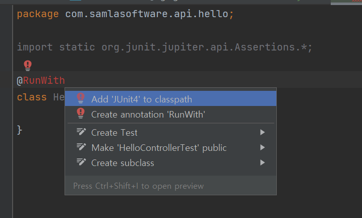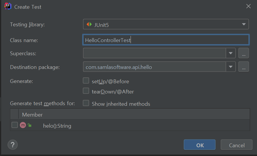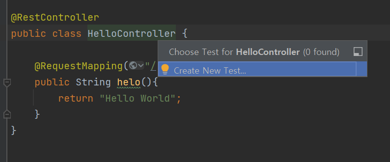 HelloController에 커서를 옮기고 Ctrl + Shift + t 를 누르면 테스트 코드를 만들수 있는 팝업이 뜬다